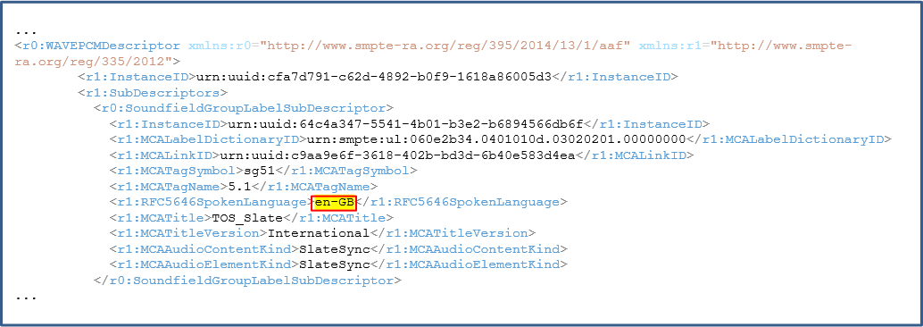 *A language tag is embedded in the MXF metadata of sound track files, identifying the spoken dialogue of the underlying sound essence. Given that the language tag is embedded in the MXF metadata, if it set incorrectly then updating/changing the language tag requires re-wrapping of all sound essence included in the associated track file.